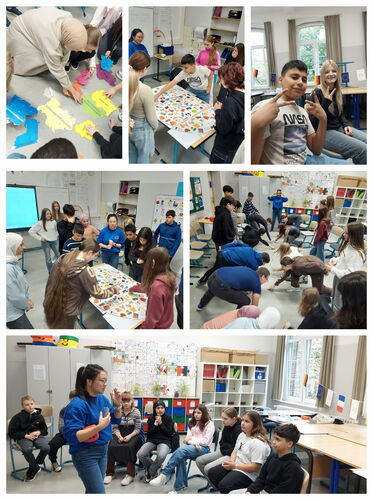 „Bonjour, je m’appelle Audrey, on va faire des jeux en français ensemble ! » begrüßt Audrey Li-Thiao-Té die Schülerinnen und Schüler der 6. Klassen in der Klosterhofschule zu ihrer Stunde mit dem France Mobil. Nach kurzer Verwirrung – Französisch lernt in dieser Gruppe ja noch niemand- verstehen alle, worum es geht: Es wird gespielt, aber auf Französisch. Das klappt überraschend gut, denn Audrey zeigt Bilder, nutzt Musik und ansprechende Spiele. Die verwendeten Wörter sind oft den deutschen recht ähnlich, so dass bald klar ist: wir verstehen ja echt viel!