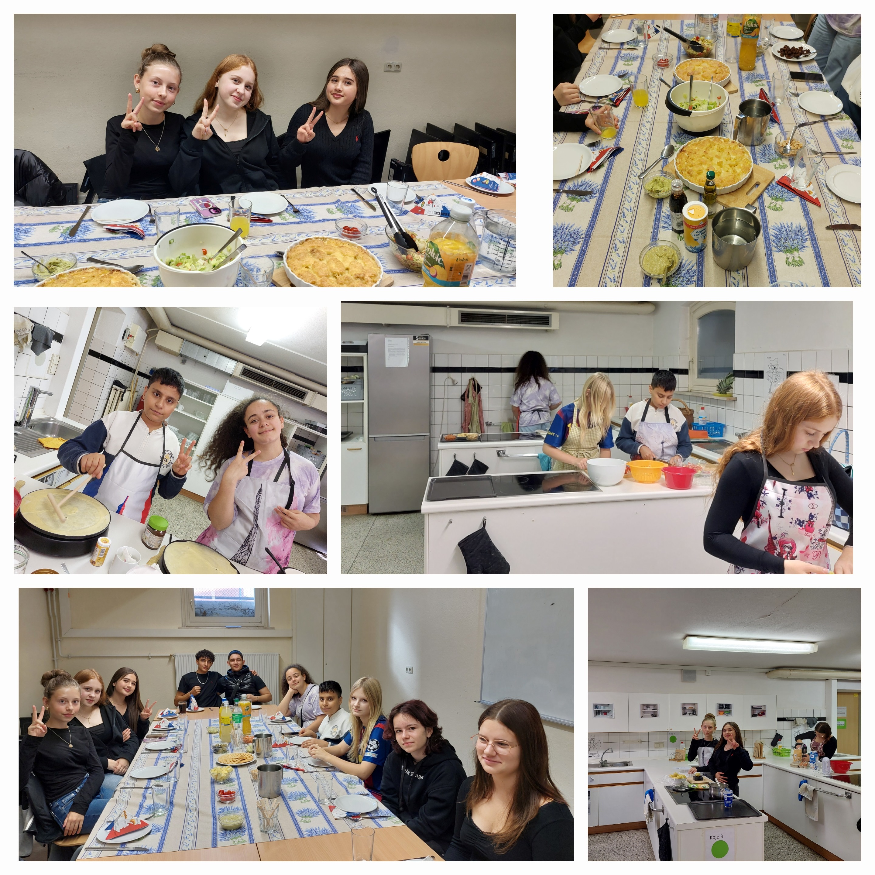 So schwangen die Schülerinnen und Schüler also den Kochlöffel und zauberten ein 4 Gänge Menü mit Aperitif, Hauptgang, Salat, Käse mit Baguette und natürlich Crêpes als Nachtisch.